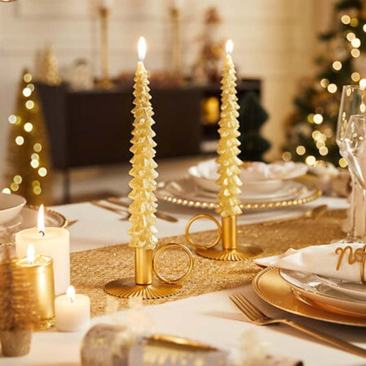 Apportez une touche chic et festive à votre décoration avec ce lot de 2 bougies bâton en forme de sapin doré, parfait pour illuminer vos tables, buffets ou coins décoratifs....