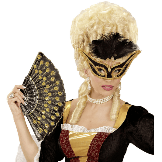 Sublimez votre tenue de fête avec ce loup Amande vénitien noir à plumes et contour doré, un accessoire élégant et mystérieux parfait pour les bals masqués, carnavals, soirées à thème...